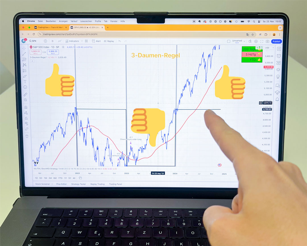 Fragst Du Dich häufiger: Wann soll ich einsteigen, wann soll ich aussteigen? Die 3-Daumen-Regel ist eine Kombination aus 3 erprobten Börsenstrategien, die Dir klare Signale zum Kaufen und Verkaufen gibt. Du kannst sie für Aktien, Rohstoffe aber auch ETFs anwenden. So kannst Du Dein Risiko reduzieren und Deine Rendite erhöhen. Im Webinar lernst Du sie im Detail kennen.