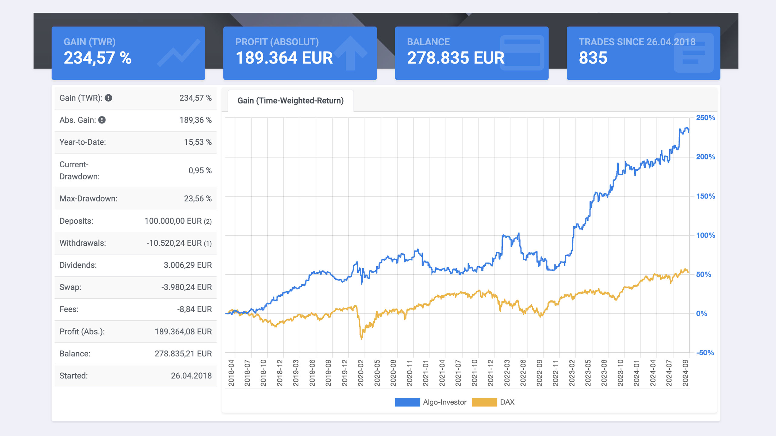 André Stagge zeigt, wie er nachweislich 234 % Performance in seinem privaten Depot erzielt hat. Und das mit nur einer Handvoll Strategien. Die blaue Linie zeigt die Kursentwicklung von André Stagge’s Live-Depot. Die gelbe Linie zeigt die Kursentwicklung des DAX-Index. Man kann sehen, dass die Strategien von André Stagge gegenüber einem Buy-and-Hold Investment eine deutlich bessere Performance erzielt haben. *)